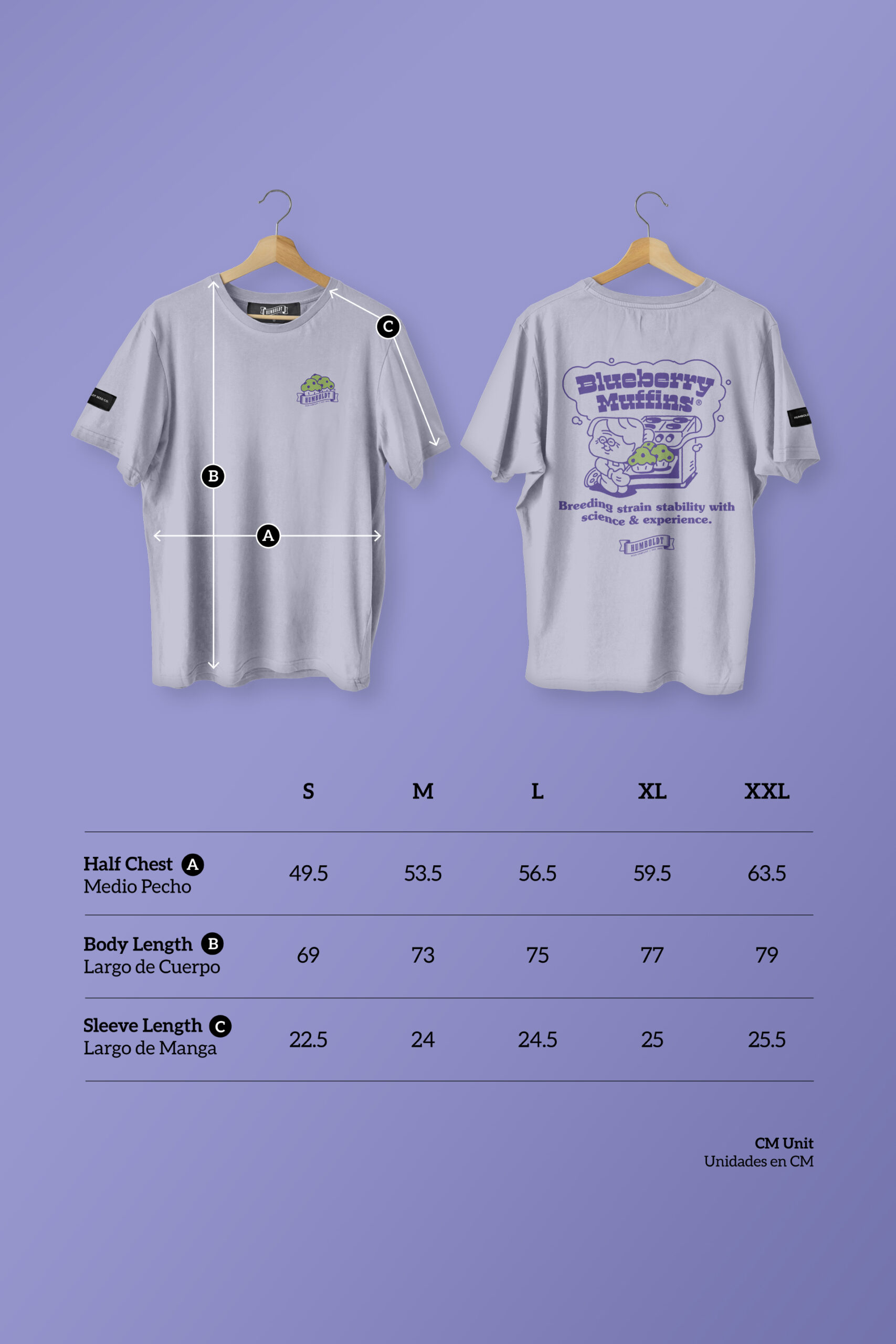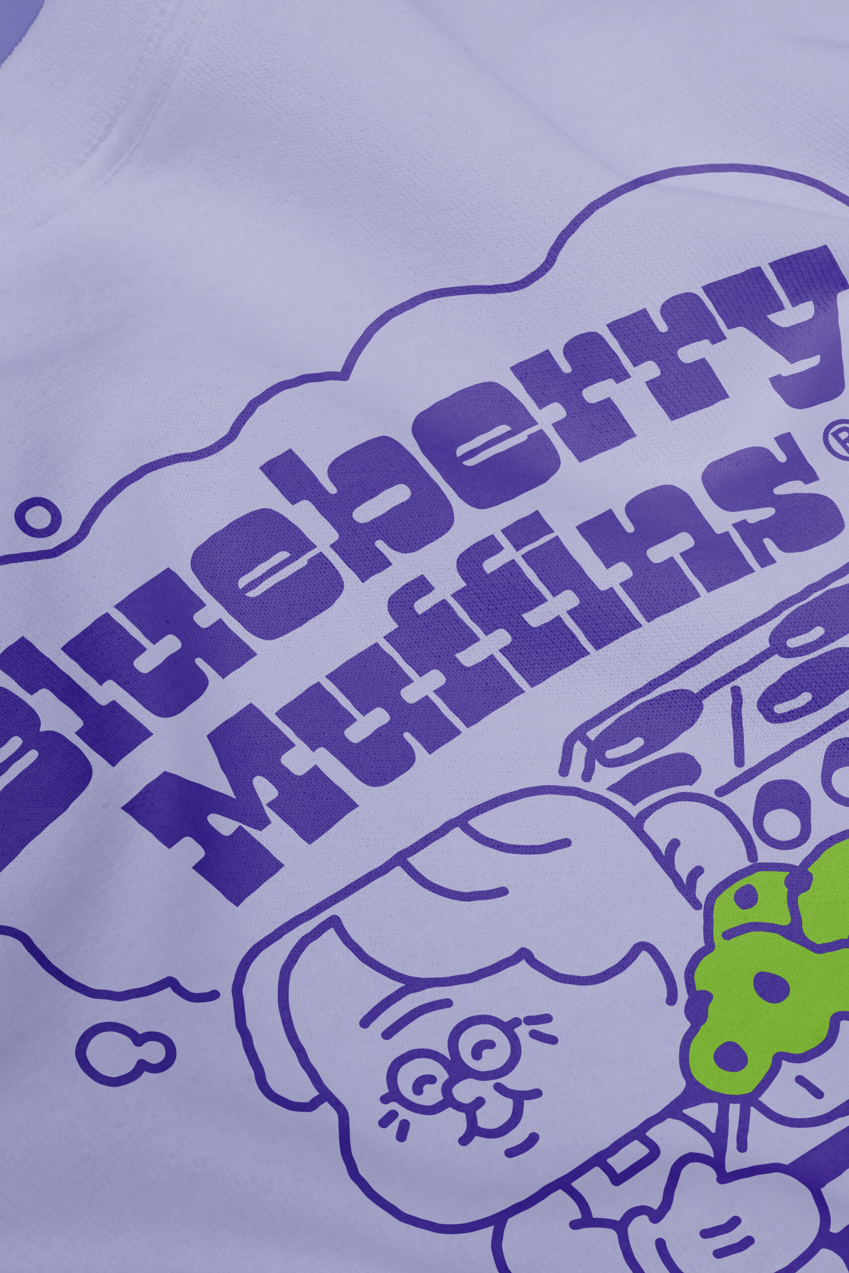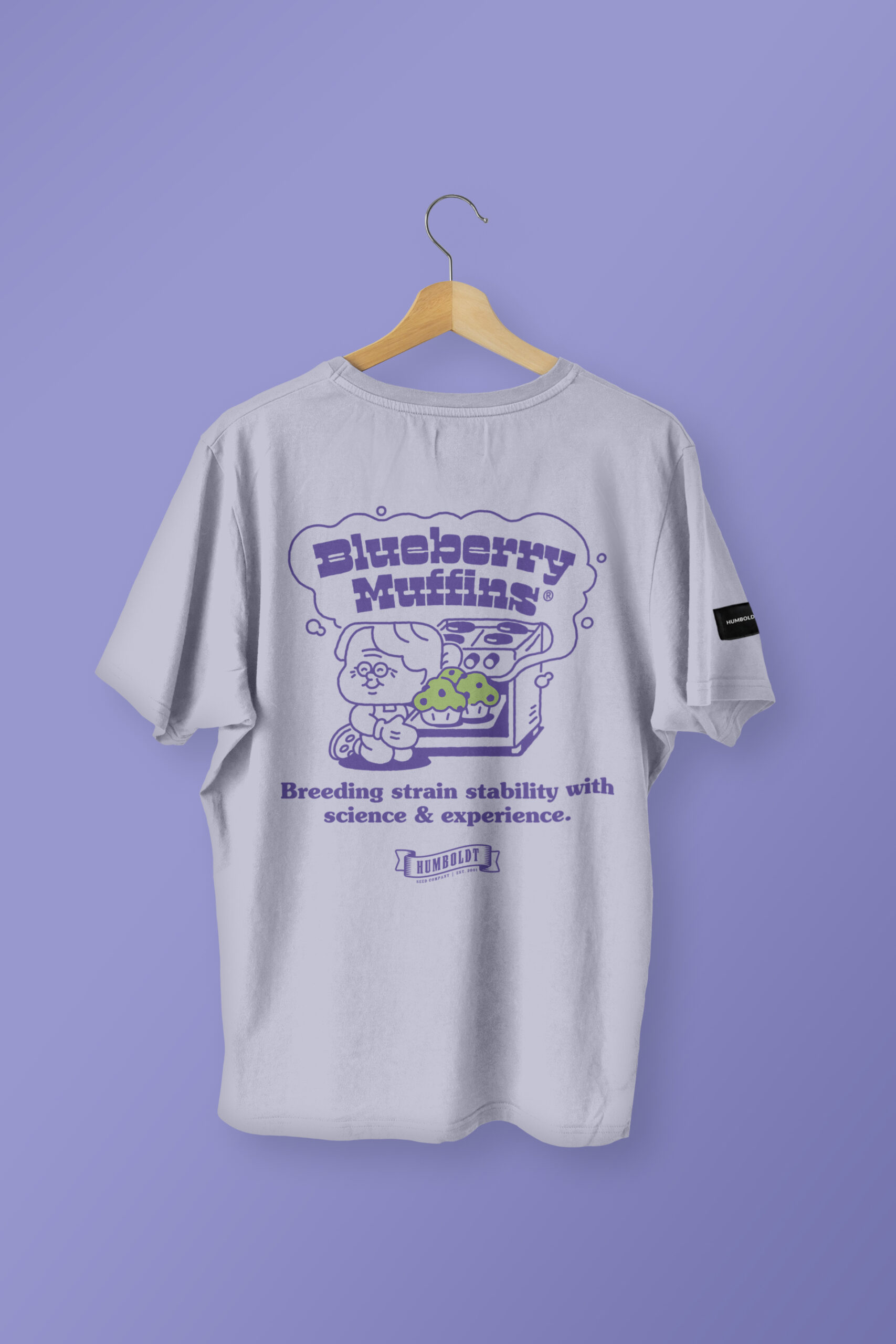 T-shirts size are slightly larger than European standard sizing, if you doubt between two sizes we recommend choosing the smaller one. Sizing chart is in the last picture. – Unisex heavy (190g/m²) jersey t-shirt, lavender color. Blueberry Muffins chest logo and back illustration. 100% Combed Organic Cotton.
